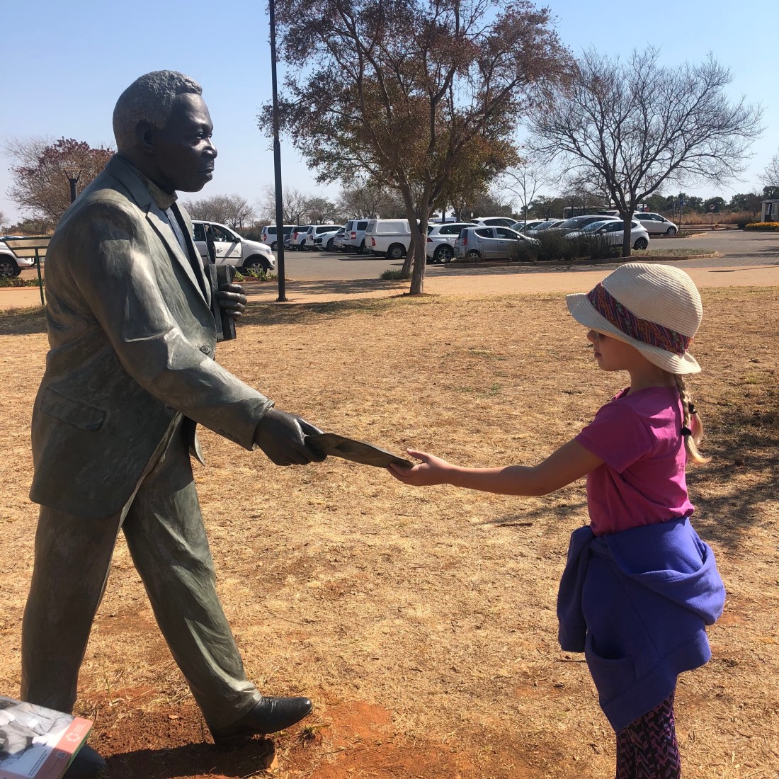 We arrived in Johannesburg and went out for dinner at Nelson Mandela square. One of the things that you have to bring to Africa is malaria pills or else you can get malaria wich is not fun! Johanisburg is a risky place. People can be on a motorcycle and ON THE ROAD they look into peoples cars while it is moving and for example, they see you on your phone. They can crash the window open and take your phone, so you better watch out!!! The next day we had a nice sleep in FINALLY, and went out to a place called Cradle of Human Kind. It is a place that has statues of people who stood up for blacks rights and those people who are not leting the blacks go to the same school. Nelson Mandela is a black man and he is one of the people who stood up for black peoples rights. Guess what? The white people put Nelson Mandela in jail in Cape Town just because he stood up for the people who had black skin. That same day we went to an evolution museum in the same area as the status. Inside I lerned about how people were first moneys then they were something called homo habilis wich is right in between monkeys and human. Then we went to the caves where the bones of the people before homo habilis were found but I don’t really recommend doing it, I liked it but I would of liked it a bit more if our guide stopped a bit less.