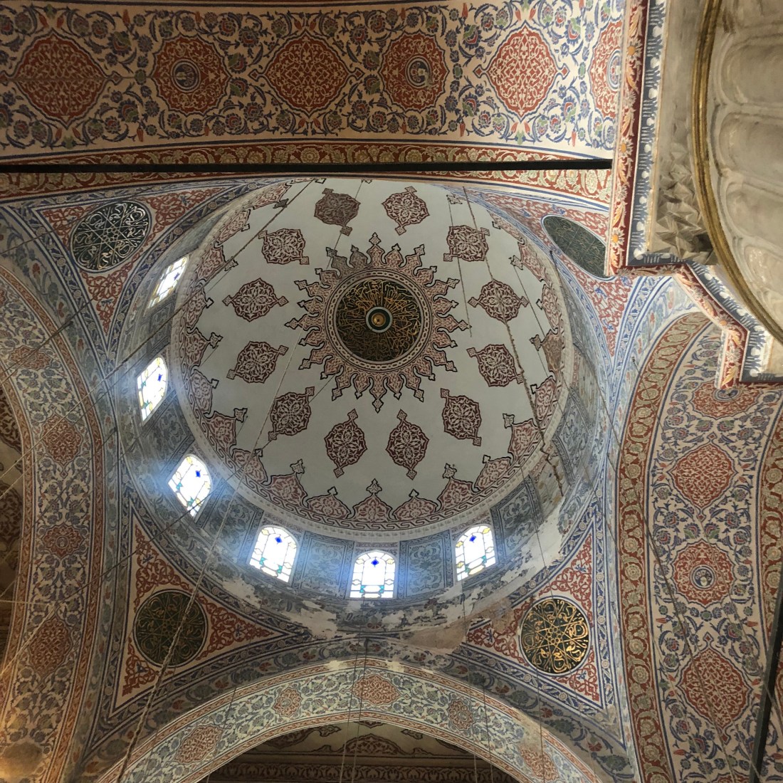The Blue Mosque was beautiful with all the handmade tiles on the ceiling and the big pillars with blue designs.