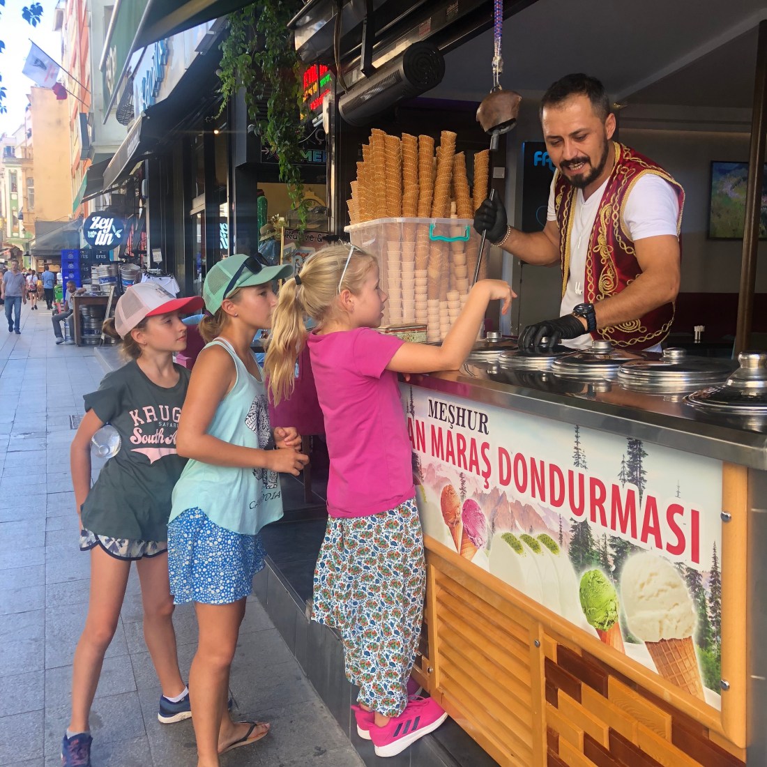 It was great! Turkish delights are jelly candies with different nuts and spices in them. My favourite were the plain ones covered in icing sugar. In the Grand Bazaar, there would be tonnes of different delight stores with samples. Go to the Bazaar hungry! Another delicious snack that we tried when we were in Istanbul was the Turkish ice cream. This ice cream is different from all the others because it was thicker, strechier and takes longer to melt.