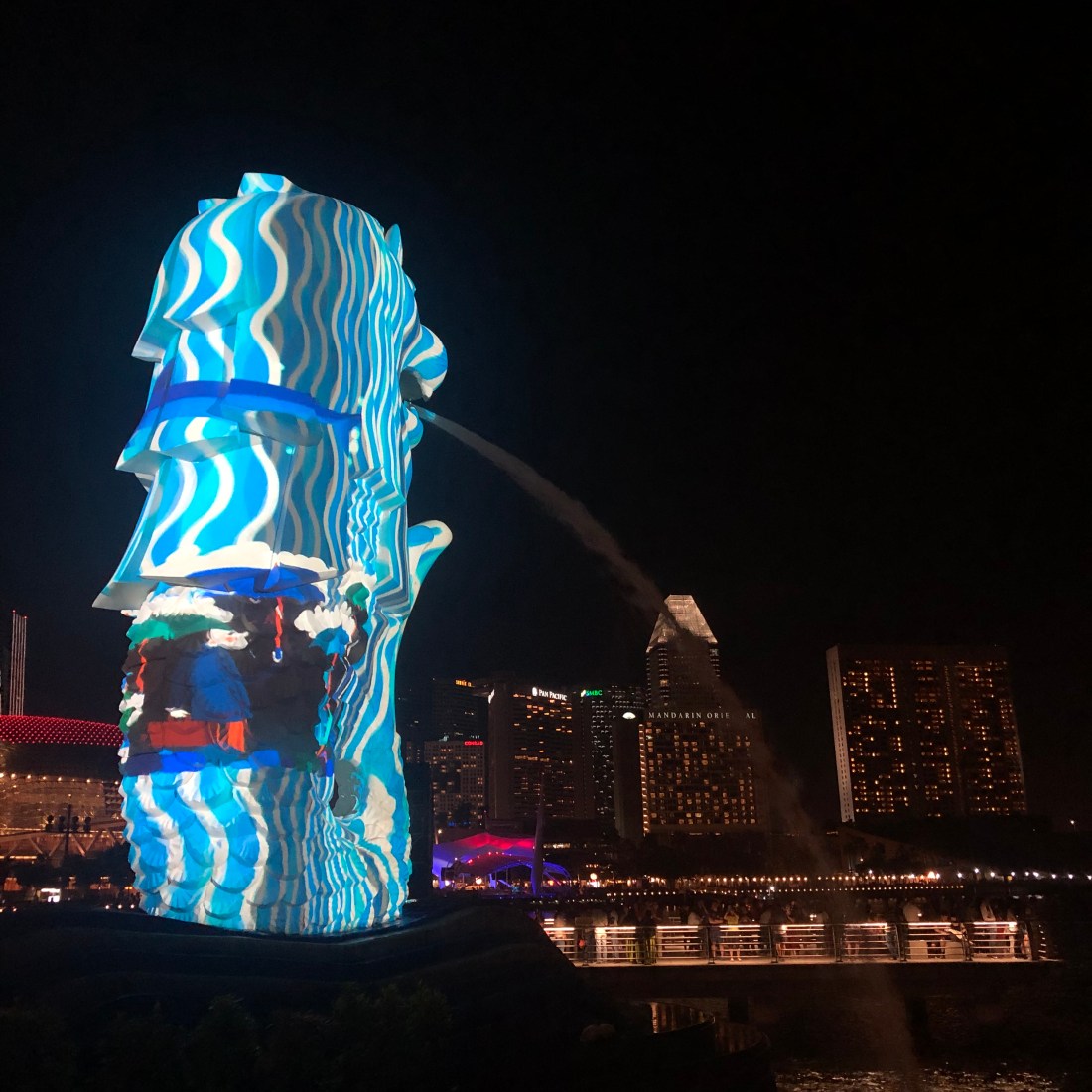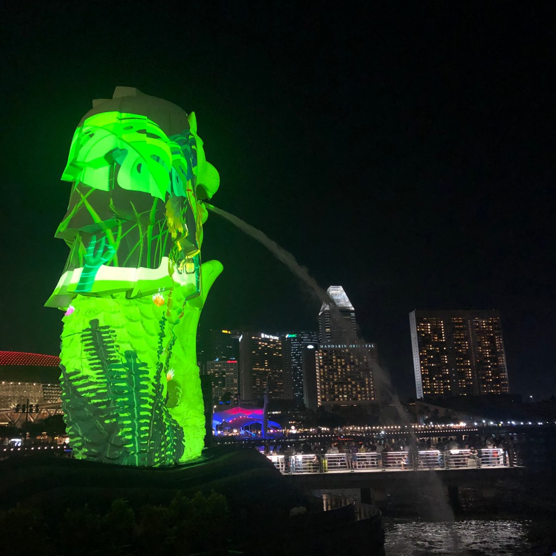 They were beautiful because they lit up the entire city. After the boat ride, we went for one more little walk before returning to our hotel to go see the……….Merlion! It was all lit up and so beautiful.