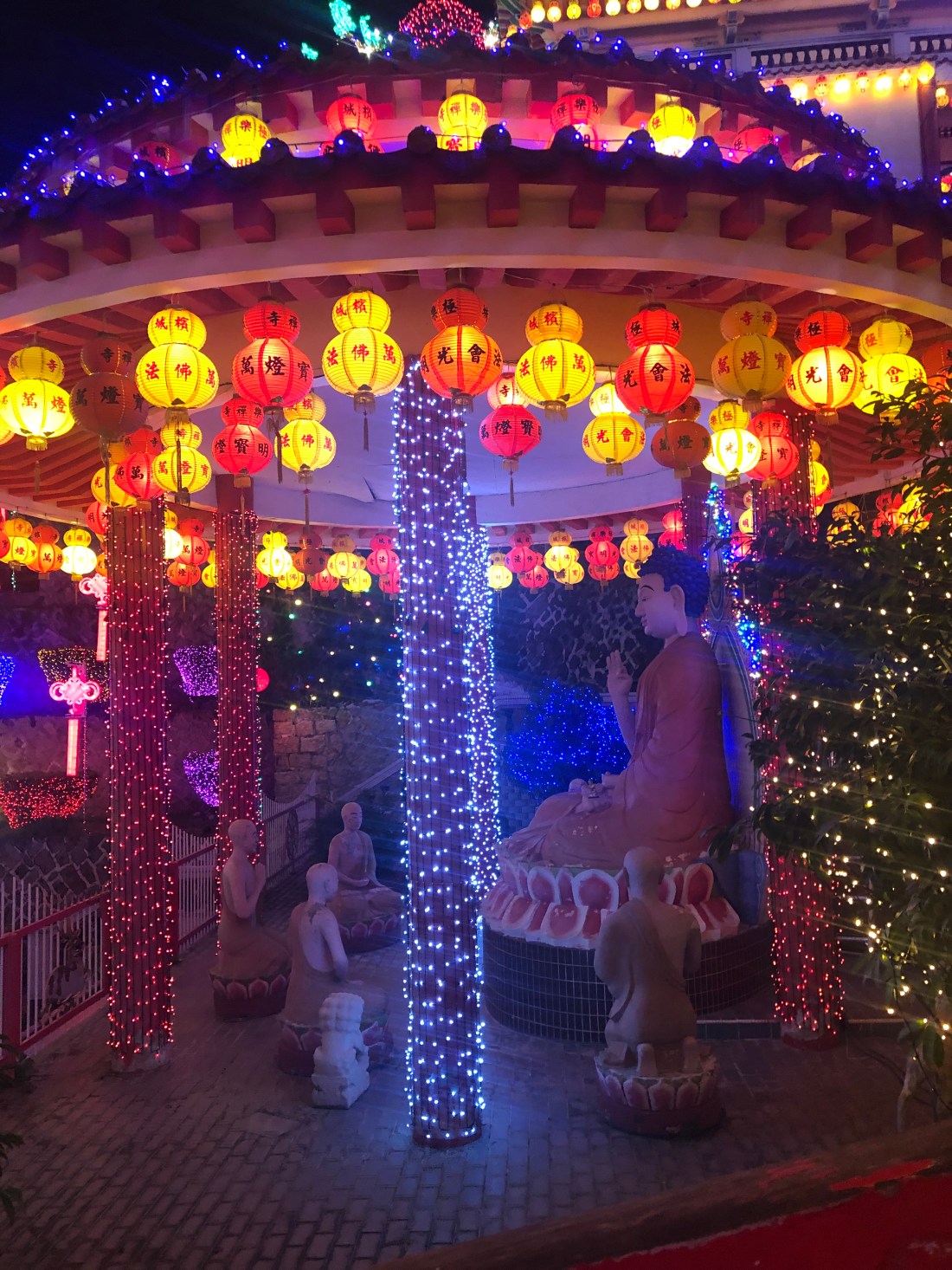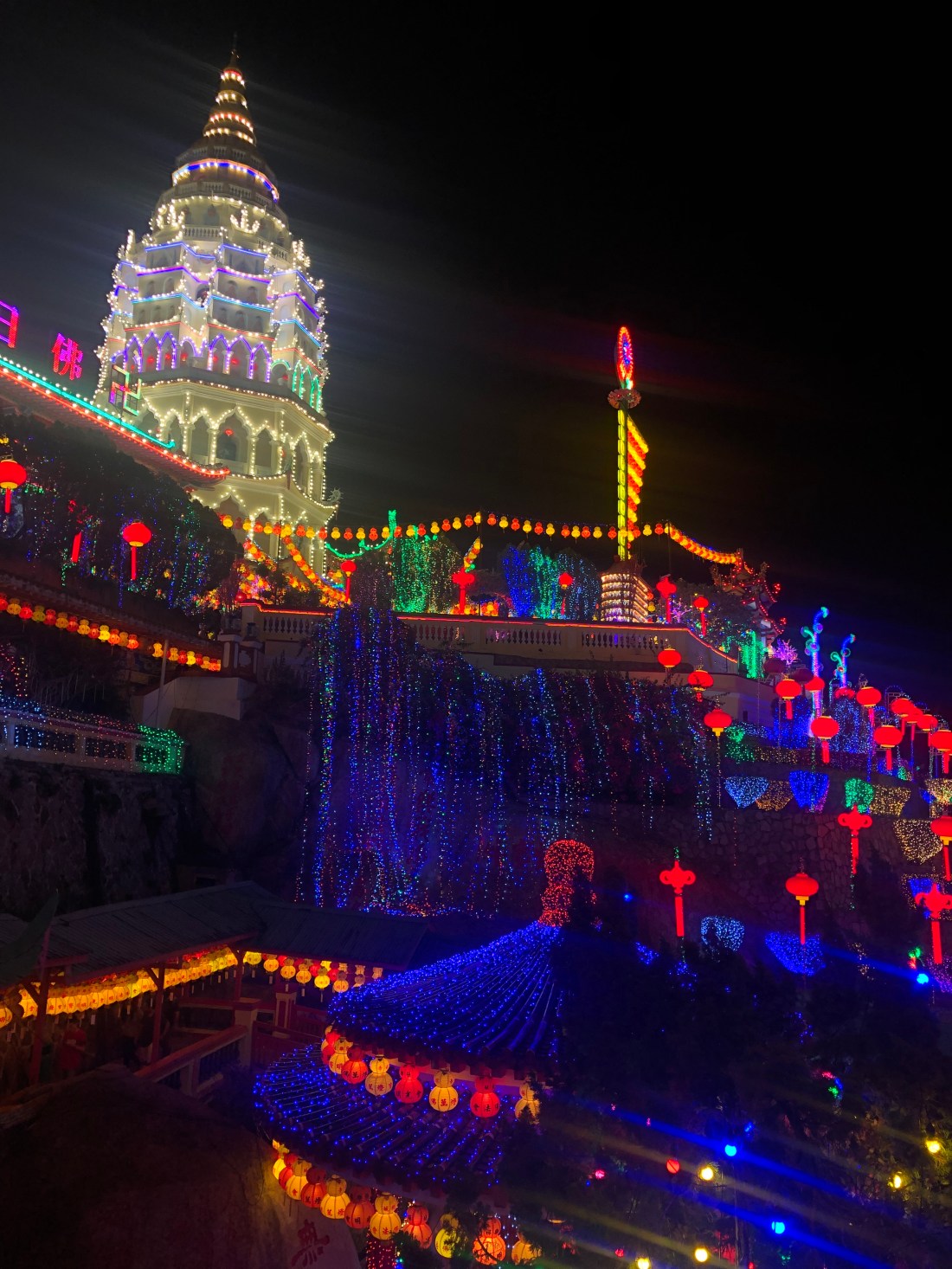 We got to the lanterns at 7:00PM. The temple was called Kek Lok Si. It had beautiful lights. There were 10000 lanterns. We wrote messages on a ribbon and put them on a wishing tree.