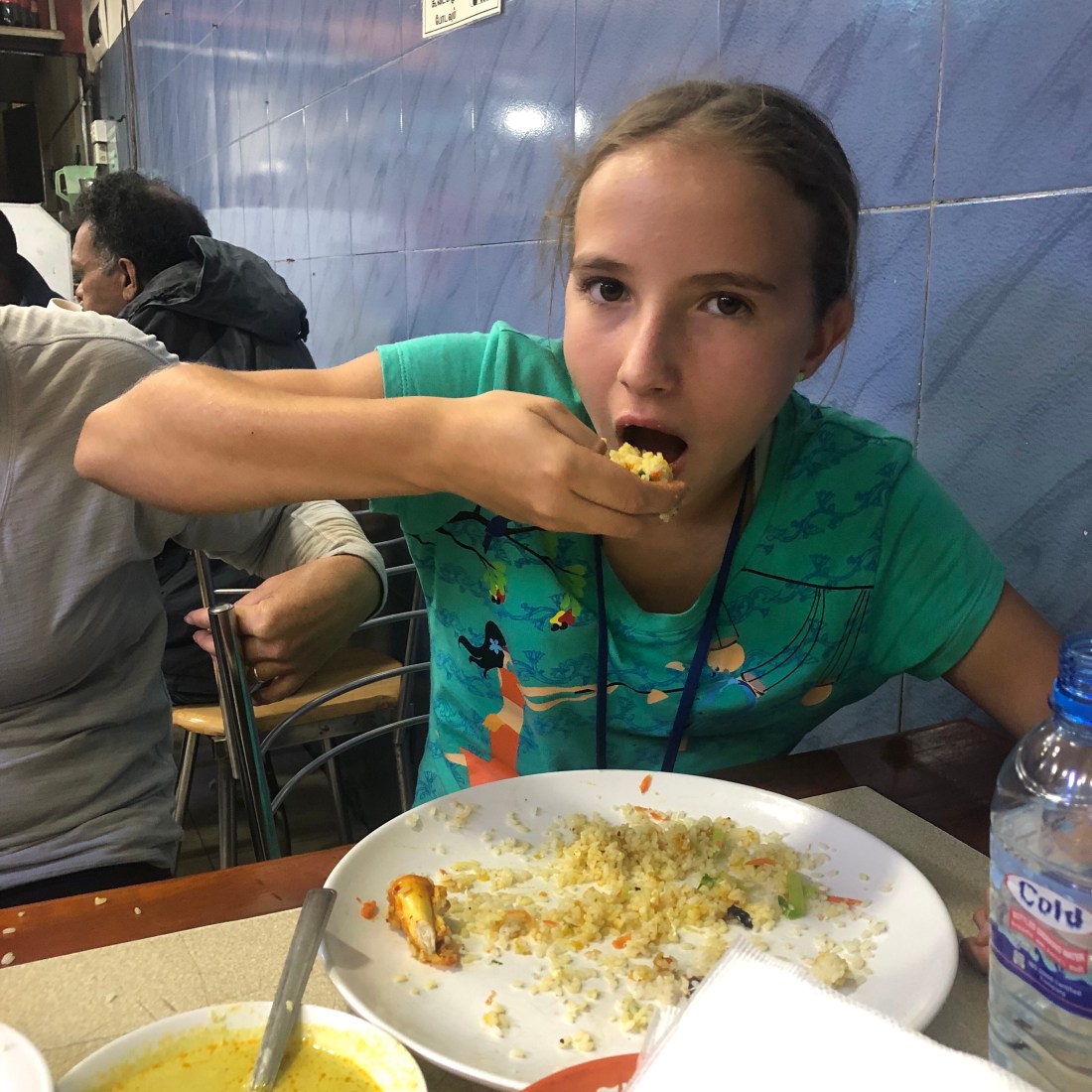 Mirissa beach was absolutely beautiful. We arrived in Mirissa with no accomadation so we decided to to check a couple of places. When we found an amazing beach house that was actually on the sand, we brought our luggage to our room and decided to go for a quick swim before dinner. The ocean was so warm and such a nice shade of blue. That night, we went for dinner at a tiny Sri Lankan bar with our guide, Chatura. We had a delicious traditional curry with dhal, vegetables, chicken and rice. The next morning, my sisters and I went right to the beach. It was a very chill day of swimming, reading, homework, and surfing. Amelie and Elise tried surfing for the first time and they really enjoyed it!